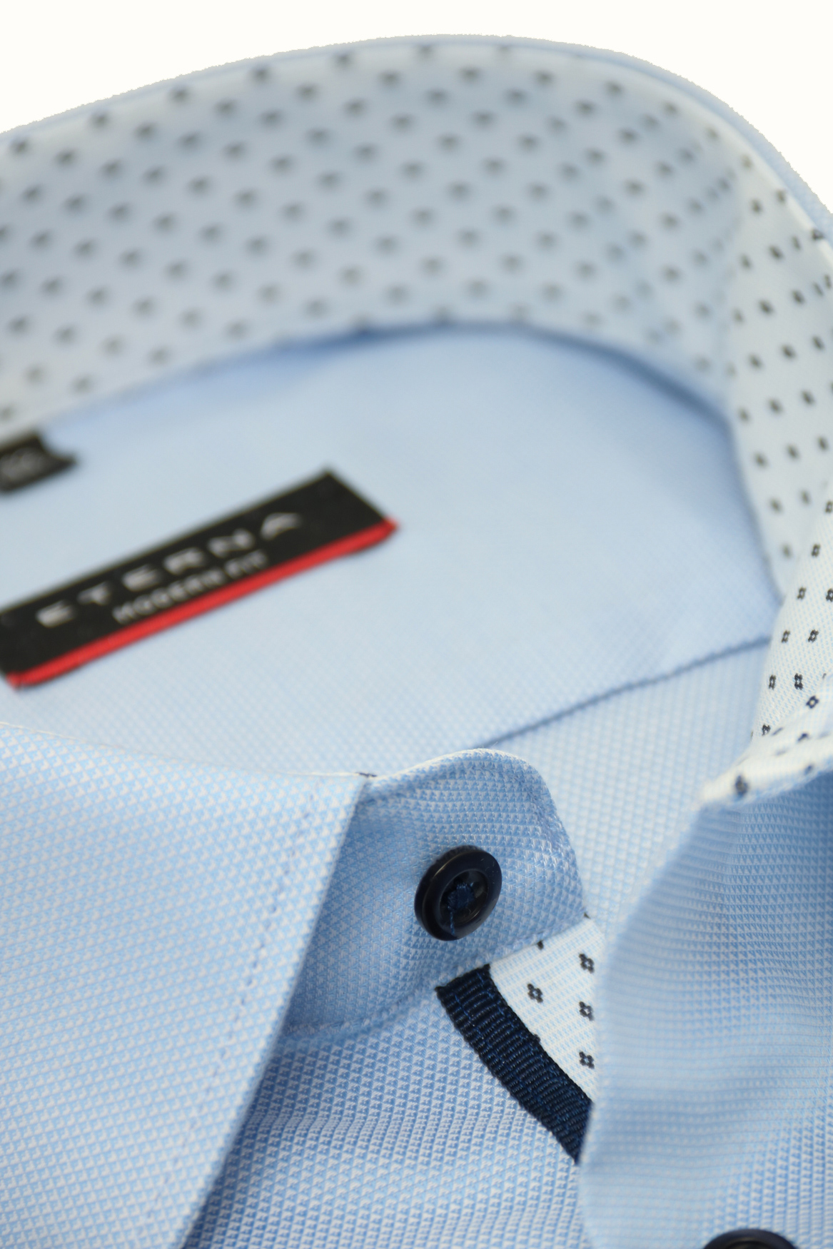 Passend zu den dunklen Knöpfen das trendiges Patch in weiß mit blauen Tupfen an Kragen, Manschetten und Knopfleiste.